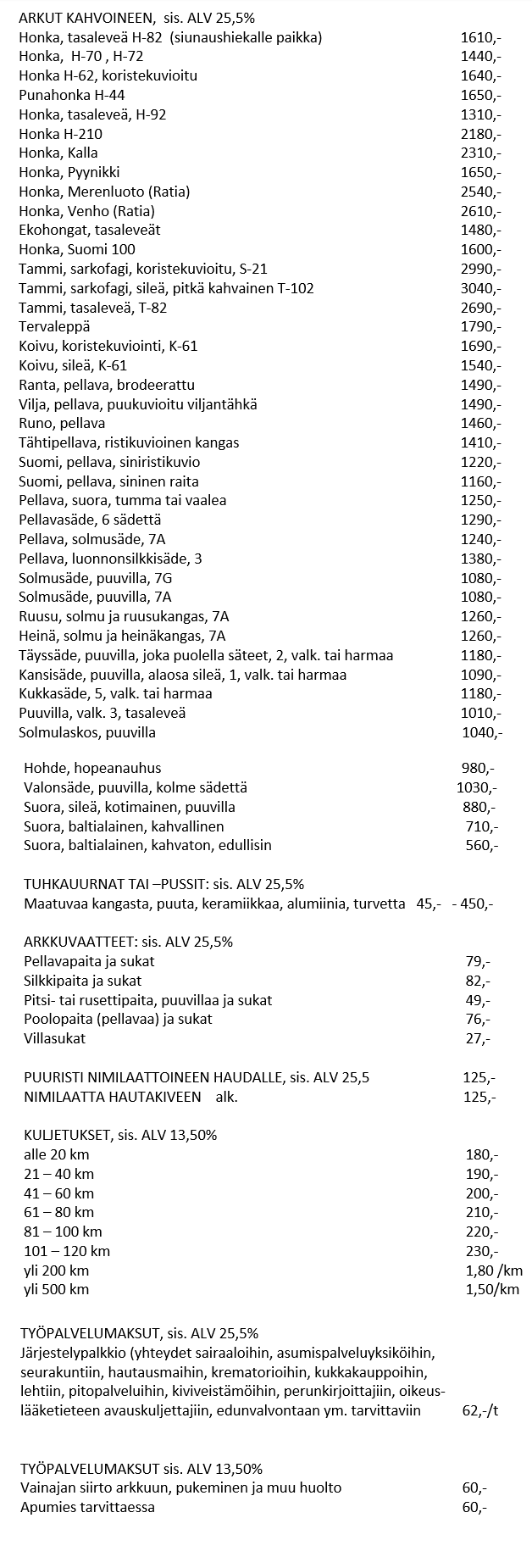 Hinnasto 1.1.2026 (sis. alv 25,5%).